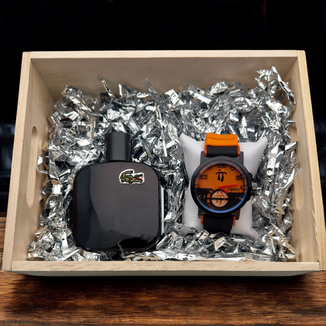 Color: Locion Lacoste black + Reloj negro-naranja